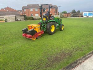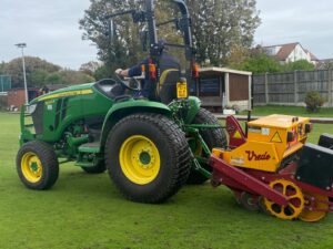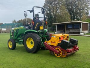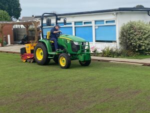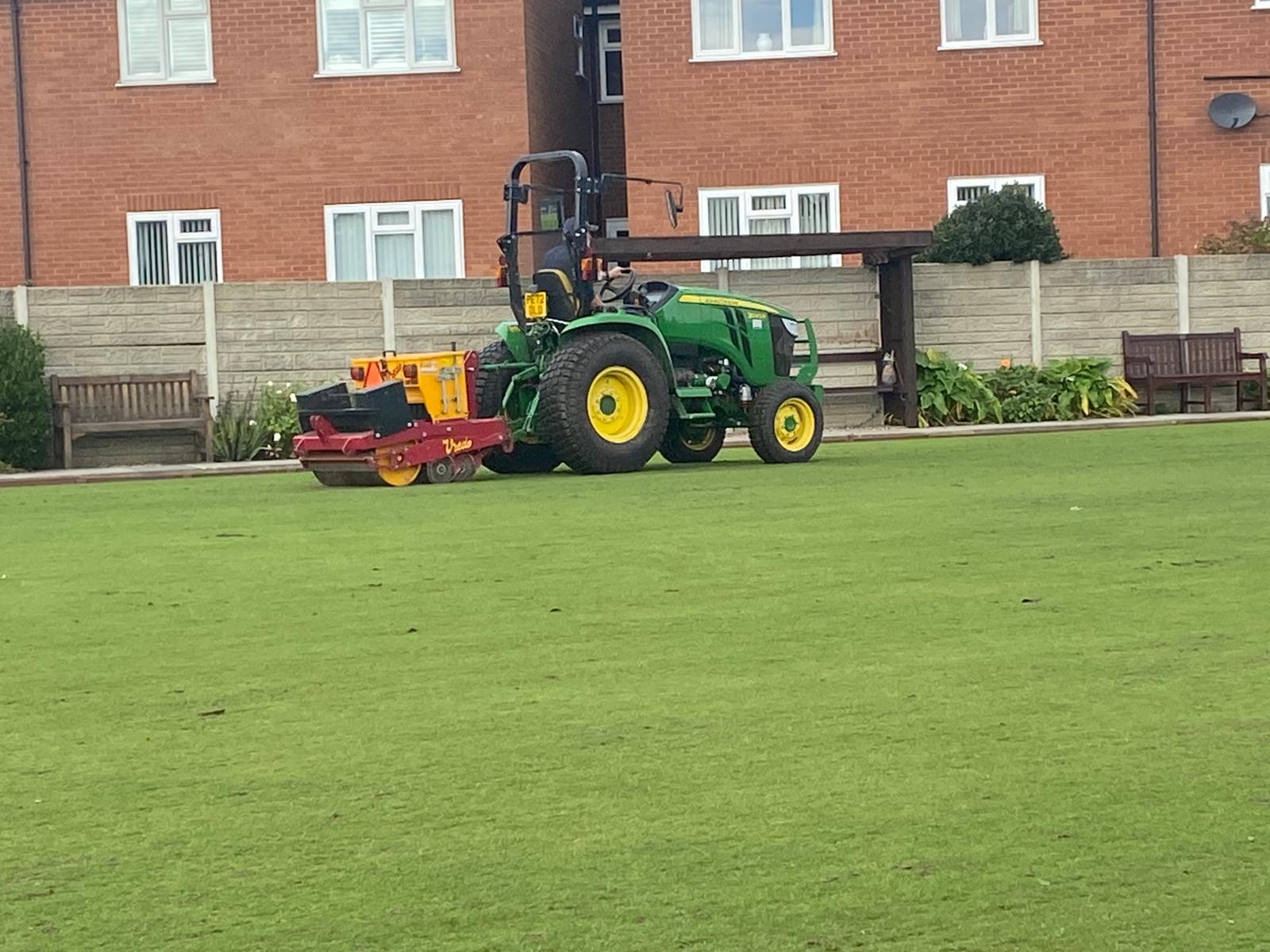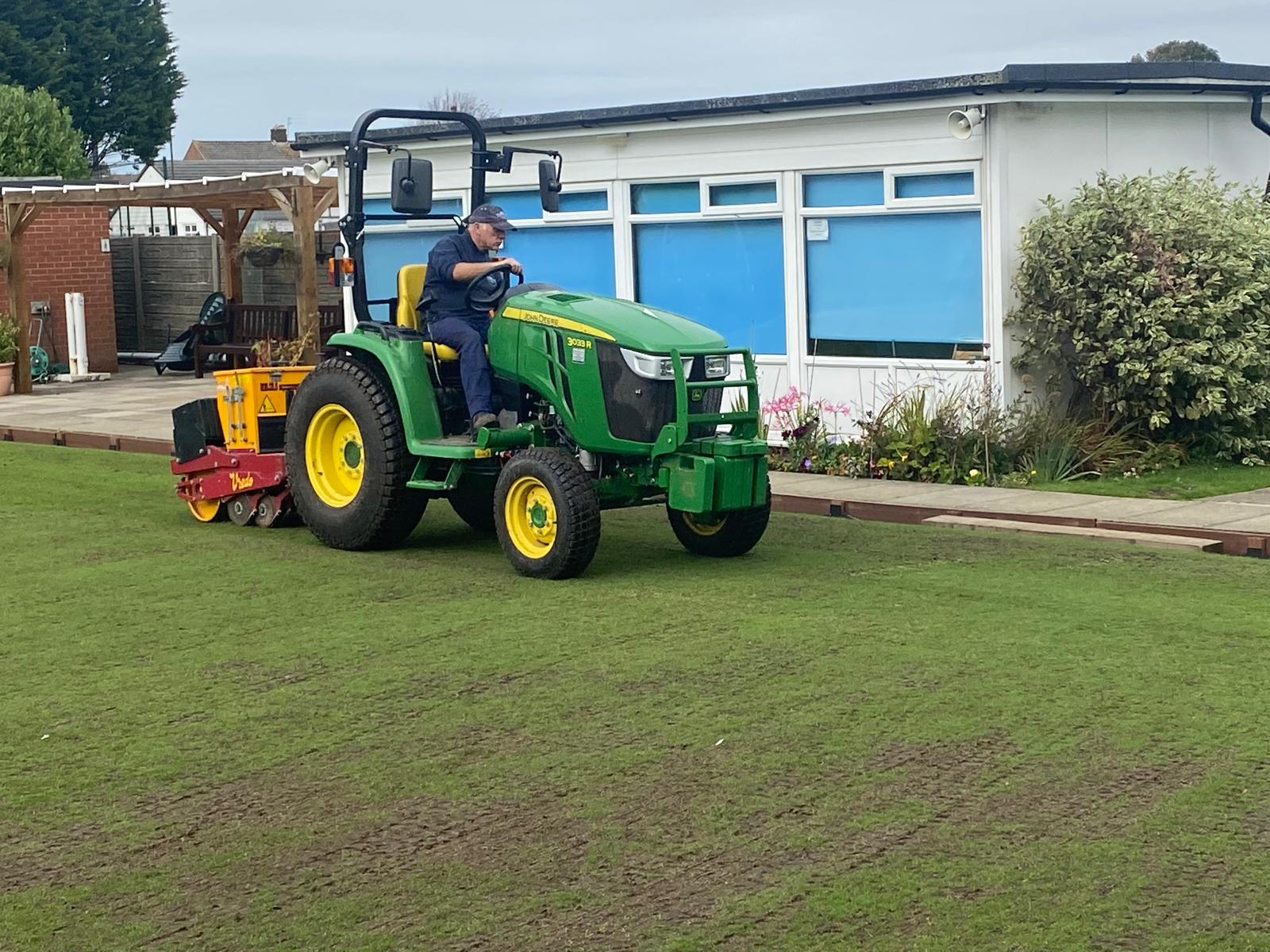 Andrew Church ( Lancashire Turf) seeded our green this morning. The green is overall in good condition with our September seeding germinating nicely. We will aerate and further treatments/ repairs next week.